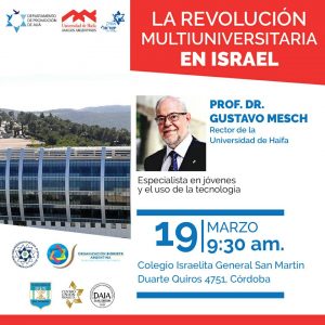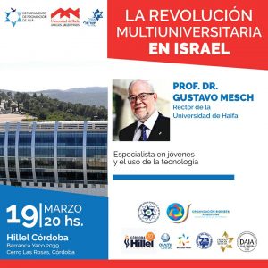 La Organización Sionista Mundial junto a la Organización Sionista Argentina, bajo la gestión del Comité Confederal, llevarán a cabo la conferencia «La Revolución multiuniversitaria en Israel», a cargo del Rector de la Universidad de Haifa Gustavo Mesch, quien es un especialista en jóvenes y el uso de la tecnología.