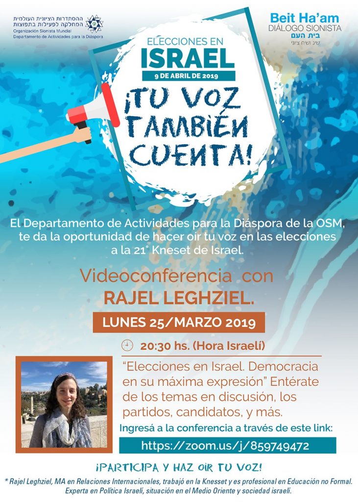 Participá de la videoconferencia «Elecciones en Israel. Democracia en su máxima expresión», que desarrollará Rajel L. Fele el próximo lunes 25 de marzo a las 20.30 (hora israelí) explicando sobre los partidos, candidatos, temas de discusión y mucho más.